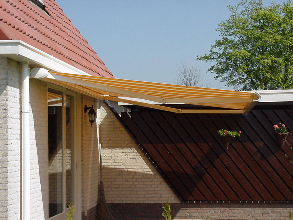 KNIKARMSCHERMEN Het knikarmscherm is gemaakt van een hoogwaardig aluminium profiel, de vormgeving van de diverse profielen is met zorg ontwikkeld, waarbij rekening is gehouden met de vraag naar de diverse bedienmogelijkheden die er voor dit terraszonnescherm verkrijgbaar zijn, hierdoor is het mogelijk geworden, dat de bediening "onzichtbaar" in het terraszonnescherm gemonteerd kan worden. Ook zijn de knikarmen van een hoogwaardig aluminium vervaardigd, en zijn voorzien van 2 geplastificeerde kabels, welke door veren gespannen worden, om een zo strak en glad mogelijk doek te garanderen. Het Luxe en Cassette 2B knikarmscherm Dit type terraszonnescherm, is een veel toegepaste knikarmscherm. Voor het vervaardigen van het frame, is gekozen voor een hoogwaardig aluminium profiel, waardoor het oerdegelijk, robuust, en van een uitstekende kwaliteit is. Dit type terraszonnescherm kan geleverd worden met een oogwindwerk (slingerstang) of een electrische bediening. Het al jaren populaire knikarmscherm, is ook verkrijgbaar in een cassette 2B uitvoering. Dit type is technische het zelfde als de luxe 2B, maar bij het sluiten van het terraszonnescherm, worden alle onderdelen, en het doek ingesloten in dit cassettescherm. Luxe 2B Het Toscana 2B knikarmscherm Dit type terraszonnescherm is zeer geschikt voor plafondmontage. door zijn compacte profiel ziet u het knikarmscherm bijna niet hangen, ook bij een geringen ruimte tussen dakgoot en het kozijn van bijvoorbeeld de schuifpui is dit een uitstekend knikarmscherm. Dit type terraszonnescherm kan geleverd worden met een oogwindwerk (slingerstang) of een electrische bediening.